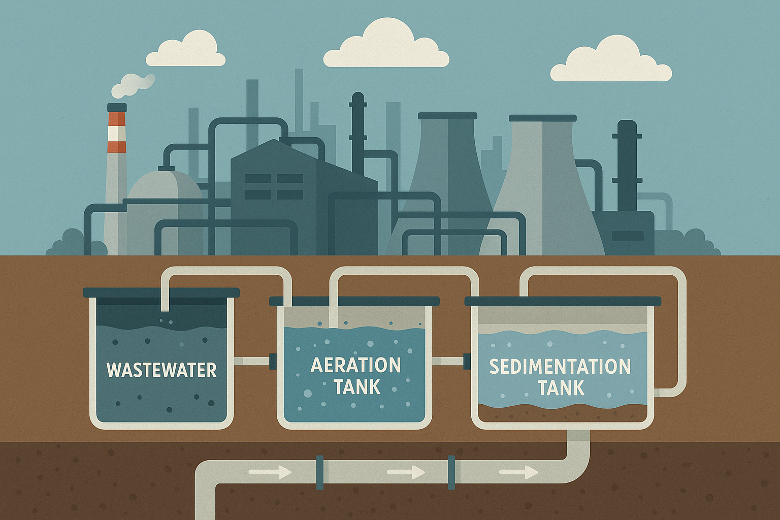 - Tangki pertama (penampungan) → tangki pengolahan biologis → tangki pengendapan → tahap akhir/disinfeksi → pembuangan atau reuse.